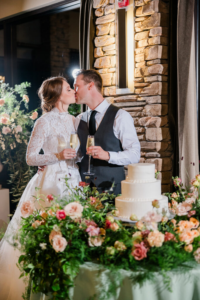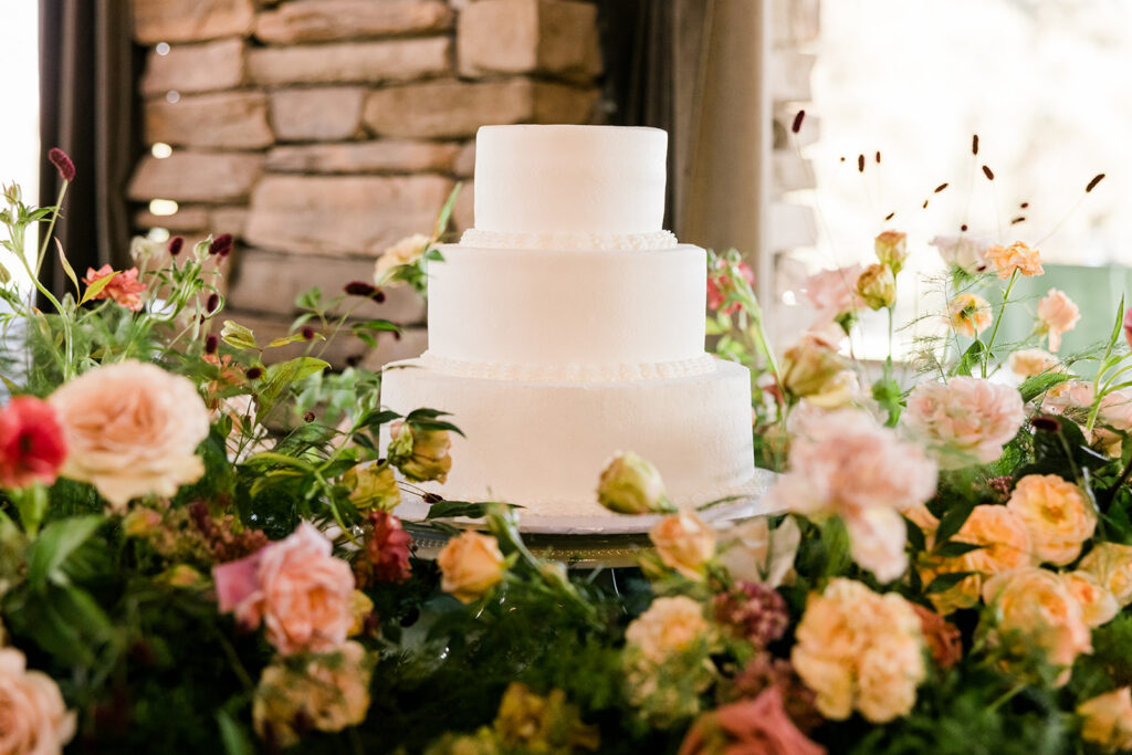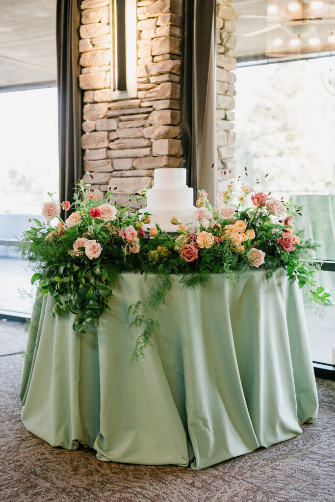 I had so much fun designing the cake table as its own little moment. We created a low floral meadow that wrapped around the base of the cake was the perfect look, featuring clusters of blooms in peach, coral, and cream tucked into trailing greenery. It felt less like a traditional cake display and more like the cake had been set into a garden, and was perfectly romantic.