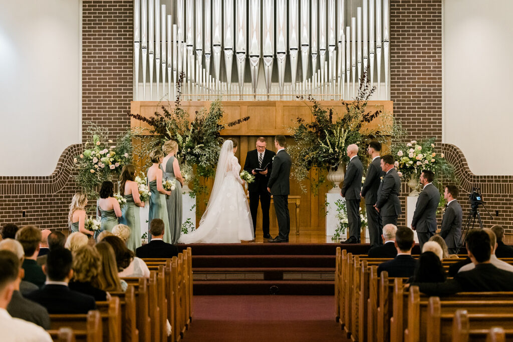 For their church ceremony, we created tall, garden-style arrangements that flanked the altar — full of movement and dimension, with trailing greenery and pops of coral and peach blooms nestled throughout. The goal was to frame the couple without overpowering the space. What I loved most was that they had an organic, collected quality that felt intentional but effortless.