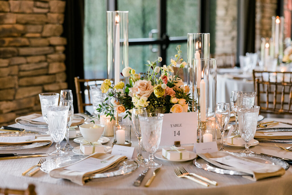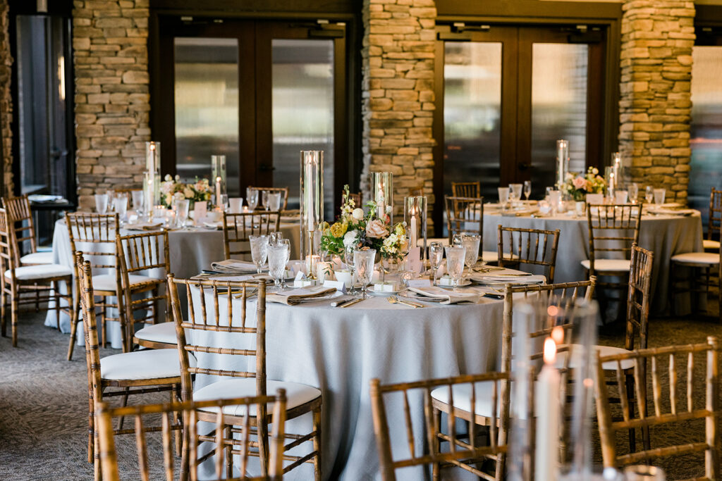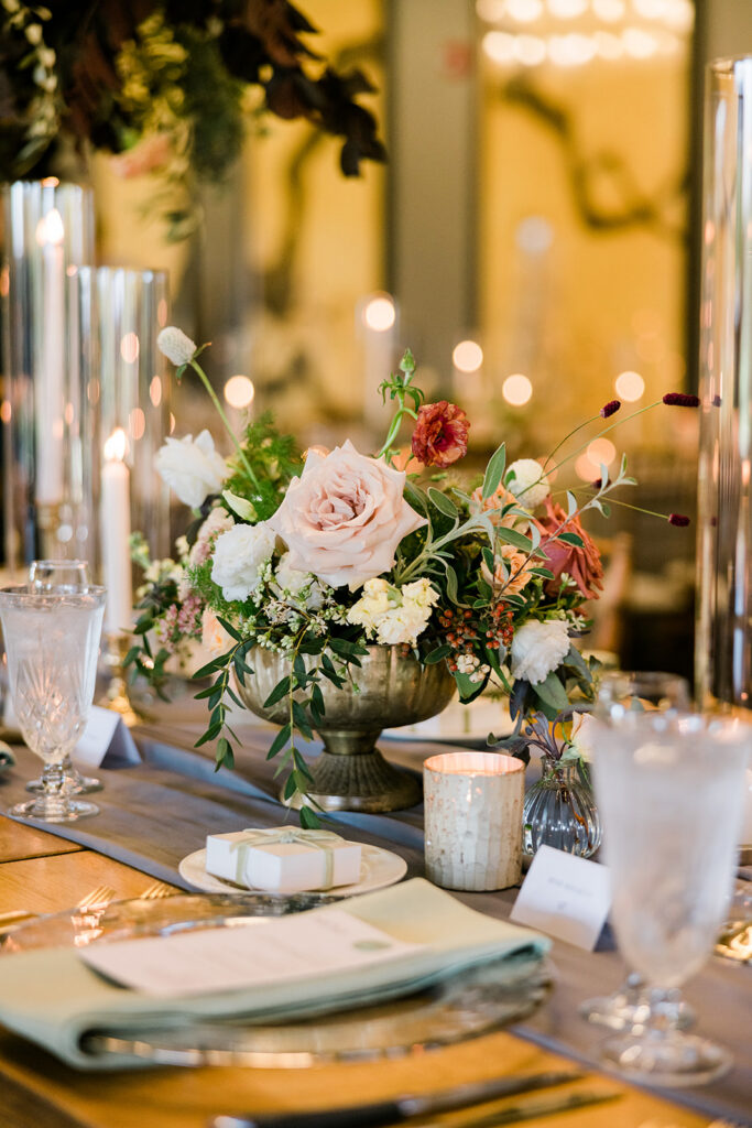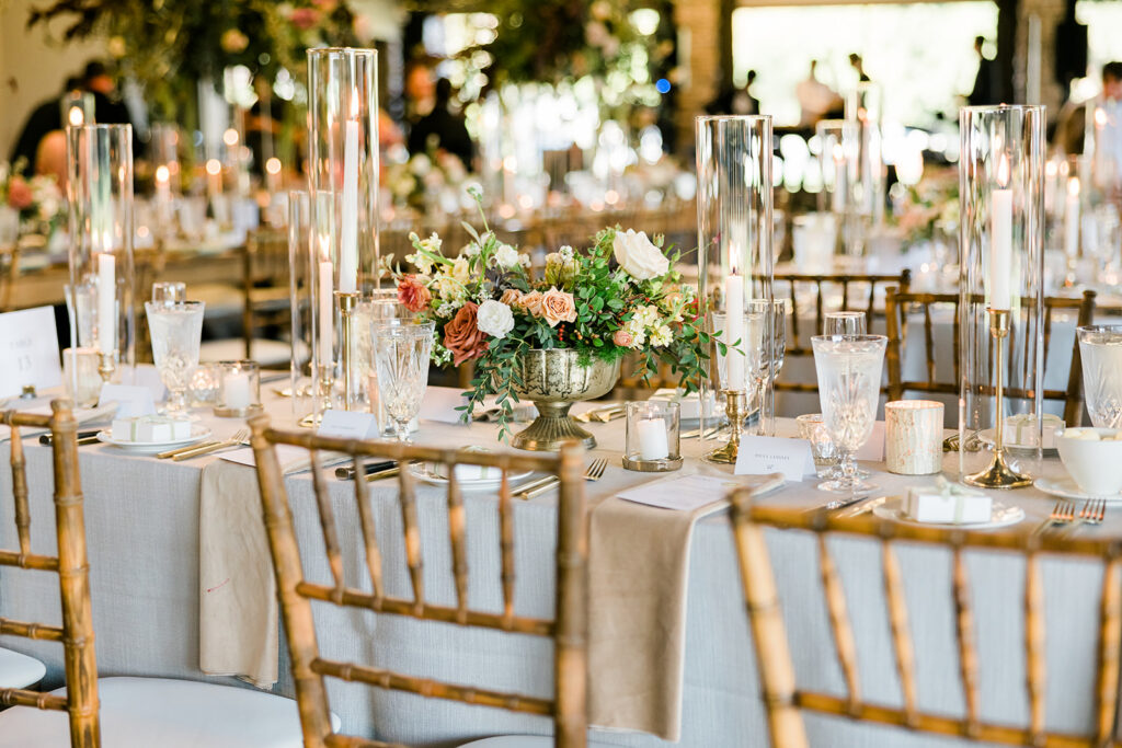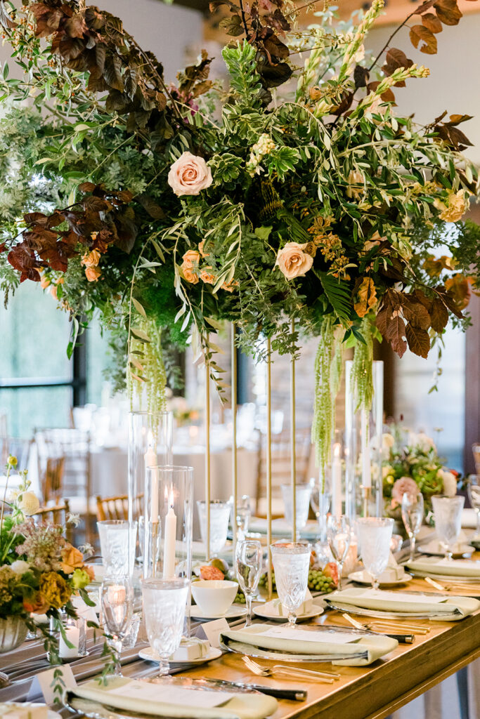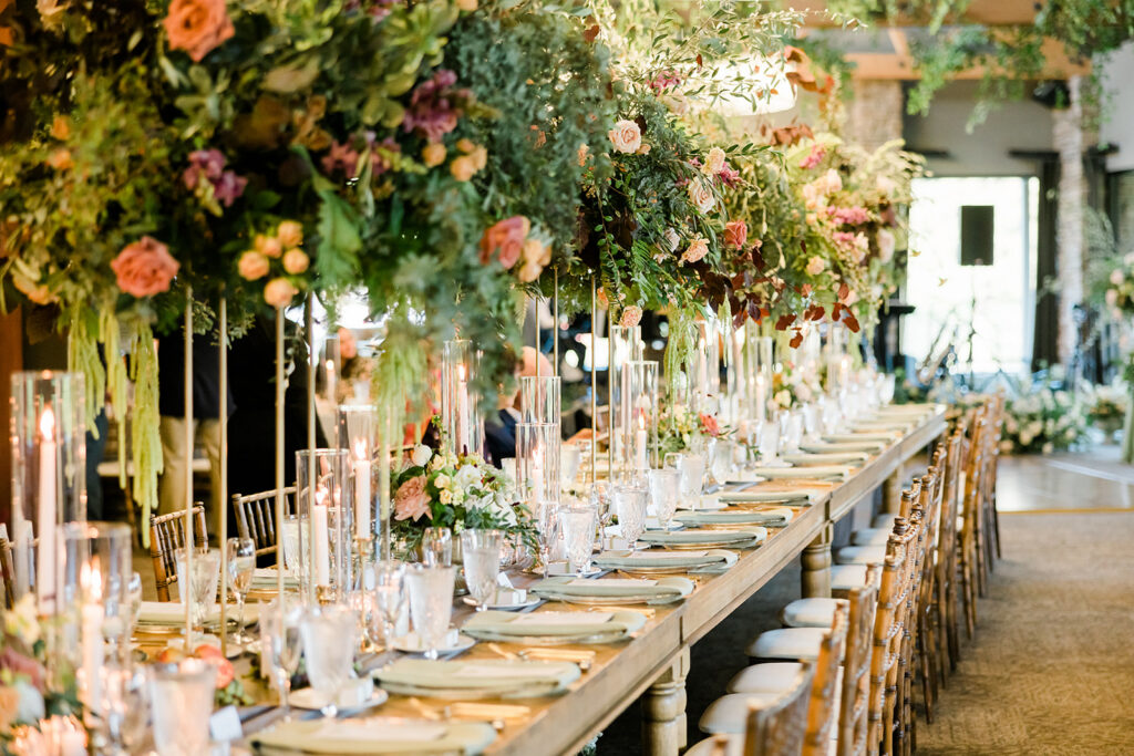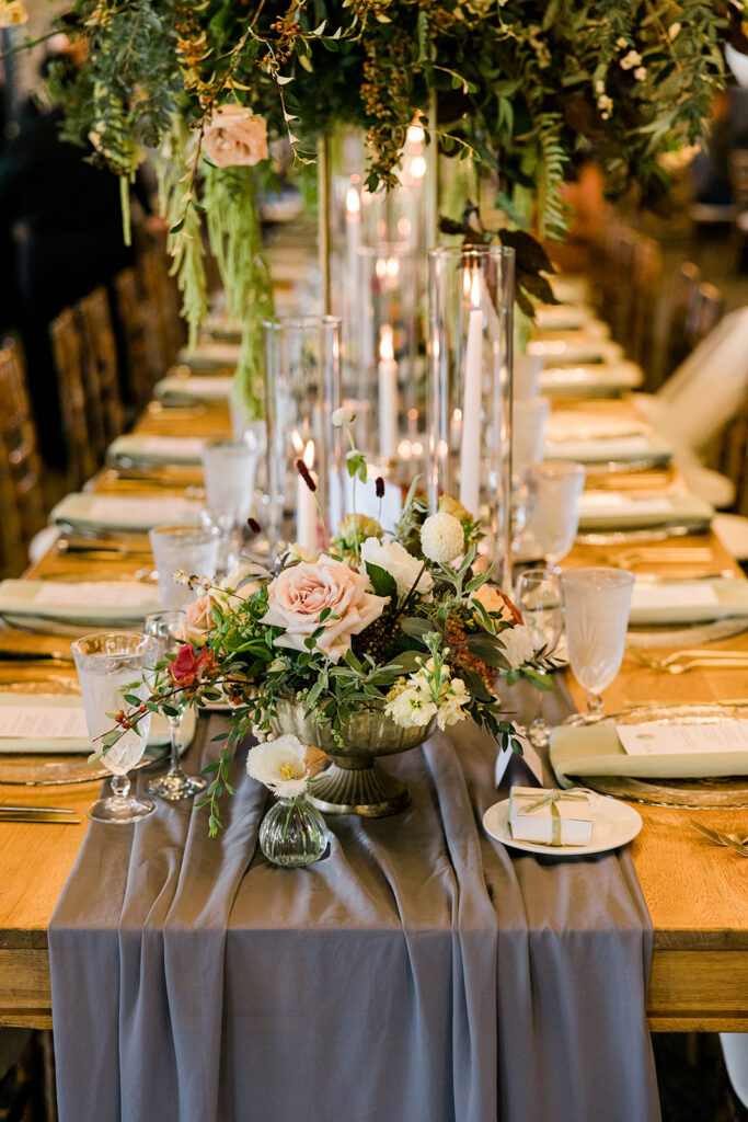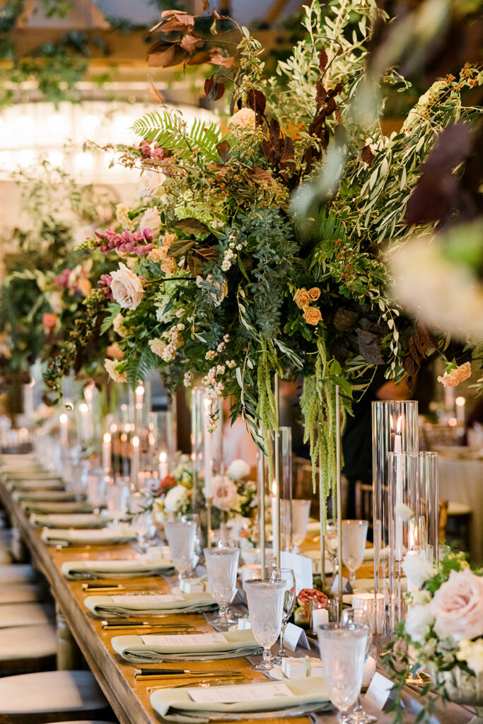 Inside the clubhouse, the reception design was all about creating a garden feel within the space. The focal point of the reception was a long wood feasting table draped with a soft fabric runner, adorned in a mixture of tall, dramatic foliage-filled centerpieces and low compotes of garden roses, lisianthus, and greenery. For the round tables, we designed low, lush centerpieces with a mix of garden roses, ranunculus, and textural greenery. And tall tapered candles in glass hurricanes added height and warmth without blocking sightlines.