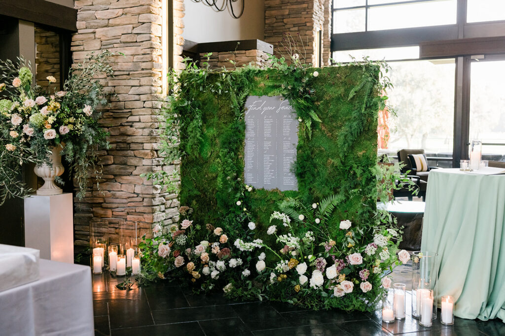 And I can’t forget to mention the seating chart! Instead of a simple sign, we transformed it into a full installation. A large frame was surrounded by ferns, Italian ruscus, and layers of texture with blooms cascading down from the top and pooling at the base. It wasn’t just functional; it was a design feature in its own right. We loved hearing that guests were even taking photos in front of it-  the sign of a detail done well.