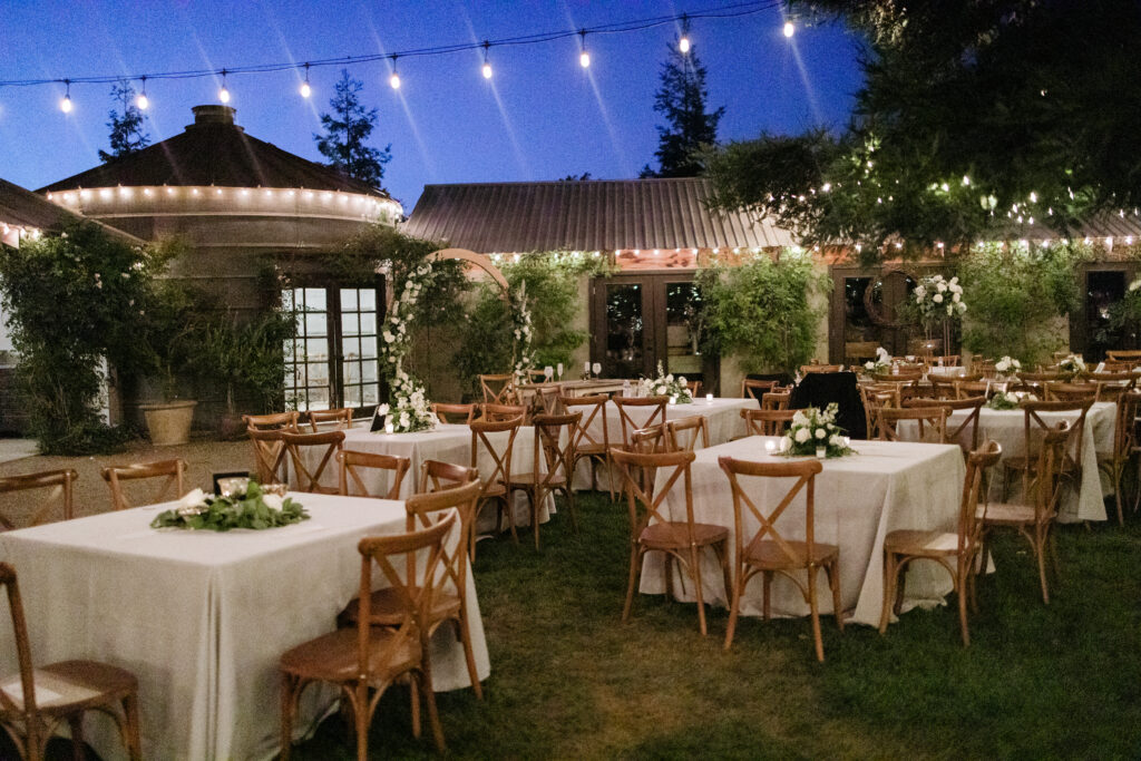 You can choose between an indoor or outdoor reception. Indoors, you’re in a modern French-inspired space with tall ceilings and gorgeous natural light through glass doors. Outdoors, you’re under a canopy of string lights woven through those mature trees — once the sun goes down it is absolutely magical. They have a wonderful team of coordinators and now offer in-house catering, which makes the planning process so much easier.